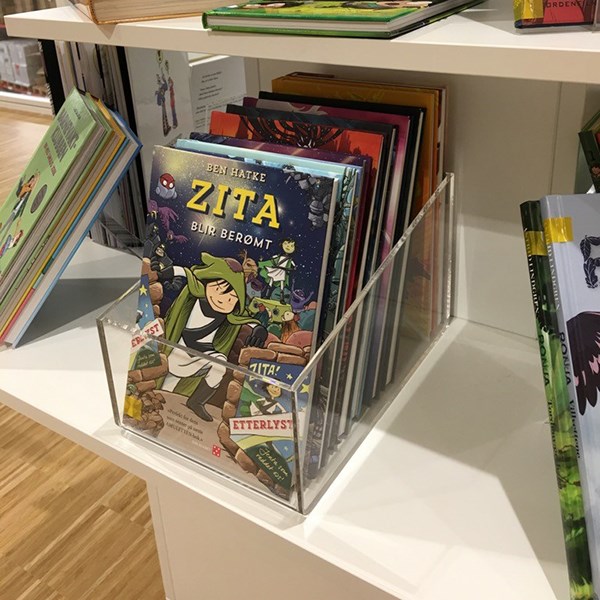Expositor funcional e elegante com painel frontal inferior que permite a navegação.