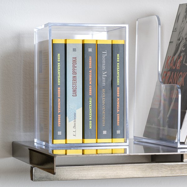 Uma caixa – duas utilizações (conforme é possível ver nas imagens) – use com a parte superior aberta e armazene o que quiser, ou vire e coloque a abertura na parte inferior e utilize como uma plataforma para exibir brochuras, livros, jornais e revistas.