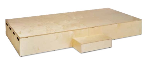 Palco composto por quatro módulos resistentes e uma etapa de madeira. Alças de transporte integradas que facilitam a retirada e o armazenamento. O lado superior dos módulos é revestido com tinta texturizada. Superfície antiderrapante para uma base segura. Naturalmente, com uma solução de conexão inteligente, para que os módulos não se desloquem durante o desempenho.