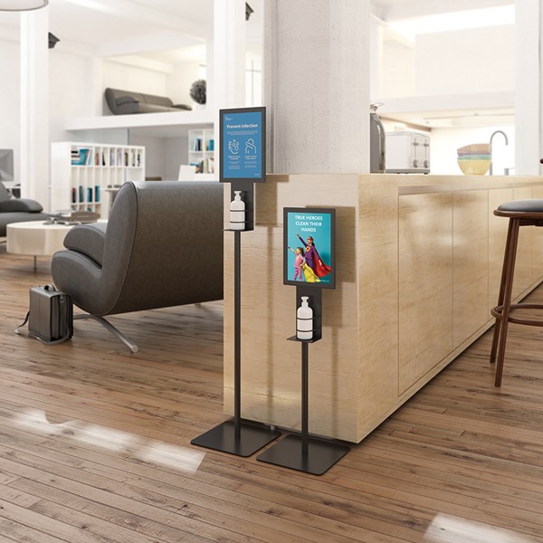 Coloque o seu suporte de chão nas zonas de entrada, zonas de retorno, balcões de informações e estações de pesquisa para garantir uma boa higiene em toda a biblioteca.